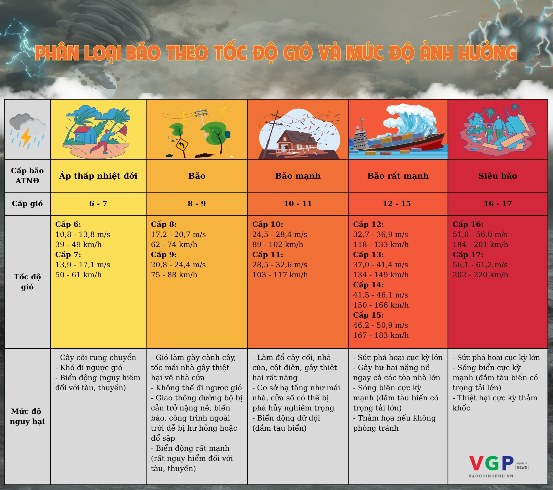 Infographics: Phân loại bão theo tốc độ gió và mức độ ảnh hưởng