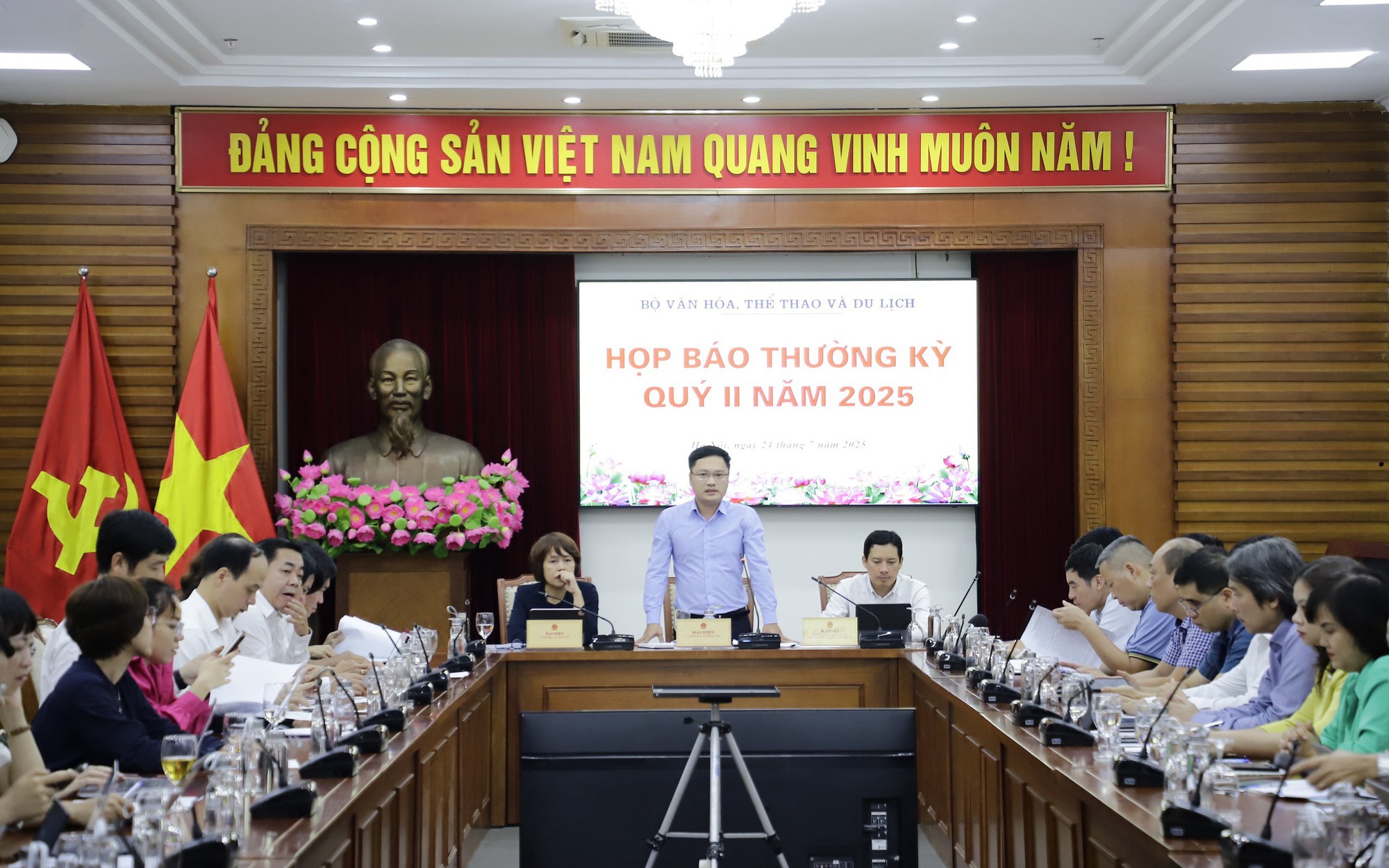 Chiều 24/7, Bộ Văn hóa, Thể thao và Du lịch tổ chức họp báo thường kỳ Quý II năm 2025. Chánh Văn phòng Bộ VHTTDL Cao Lê Tuấn Anh chủ trì buổi họp báo.